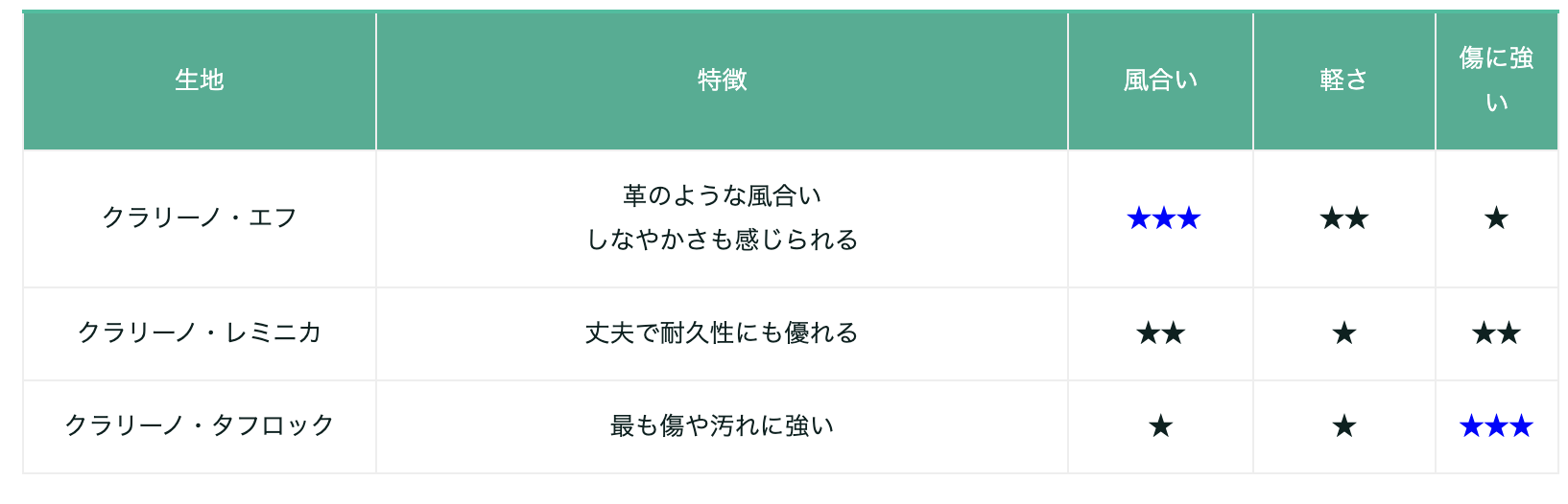 また、カザマは同じクラリーノでも3種類あり、それぞれの特徴は以下の通りです。