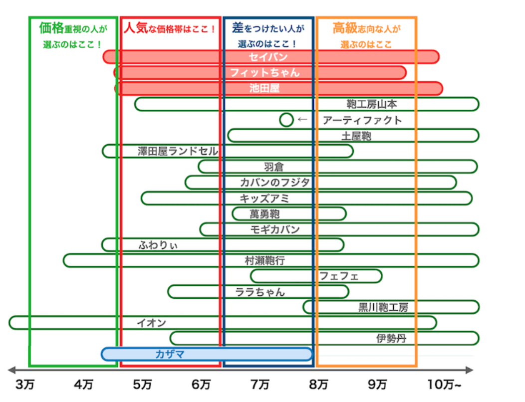 カザマランドセルの価格帯を、近年人気のランドセルメーカー各社と比較すると以下の通りです。