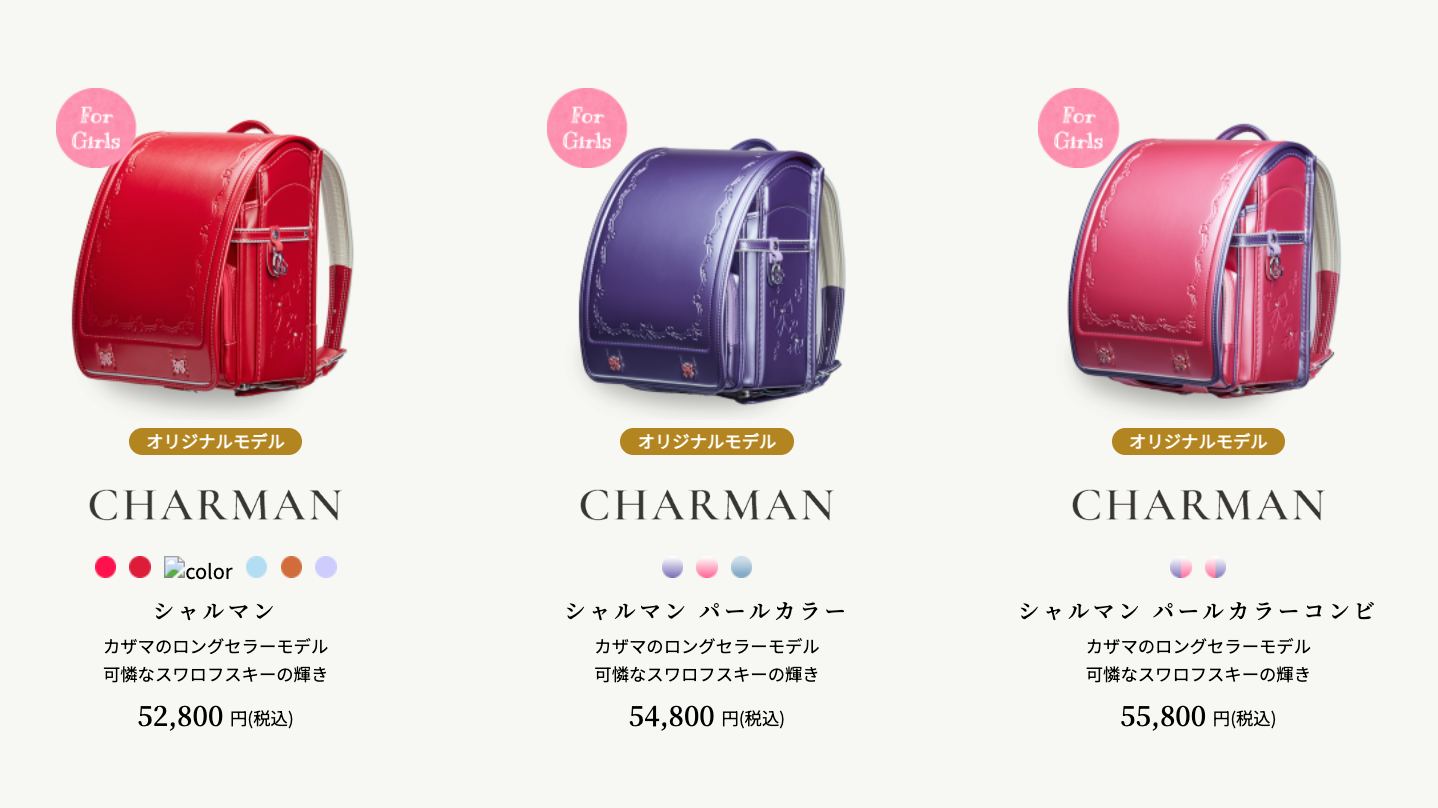 カザマは職人による手縫いのランドセルなので、他社と比べても品質は閲して見劣りしません。 さらに、高級感溢れる正統派モデルはもちろん、特に女の子用は個性的なデザインや色も多いと好評です。