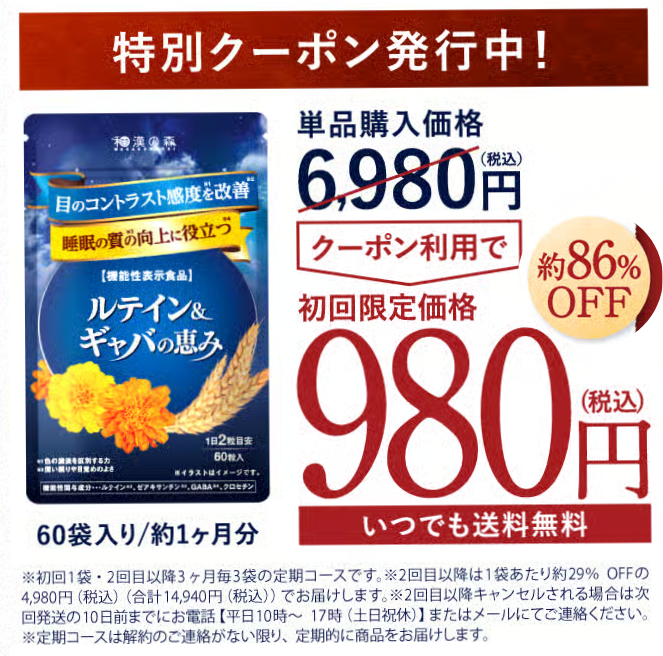 価格はルテインサプリの中では割高ではありますが、初回は980円で始められて、定期縛りもないので、気になる方はぜひ一度お試しください。