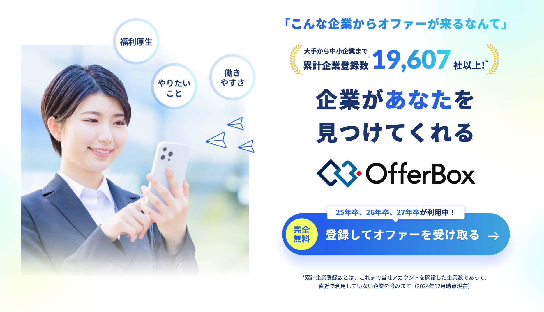 • 初めてなら OfferBox がおすすめ。幅広い企業とつながれるチャンスが大きいです。