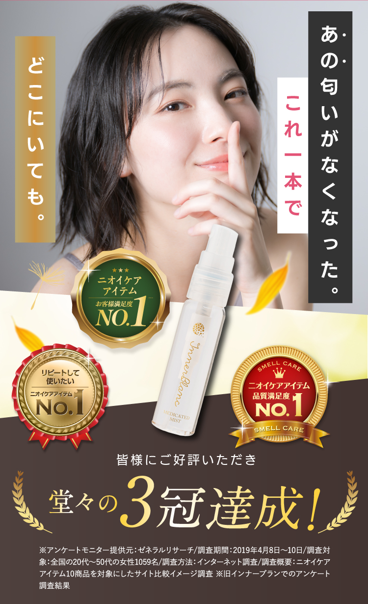 | インナーブラン | ◎ 即効性あり | ◎ 医薬部外品で安心 | 無香に近い微香(清潔感) | ポンプ式・広範囲ミスト | 通常7,029円 → 初回2,178円(30mL) |