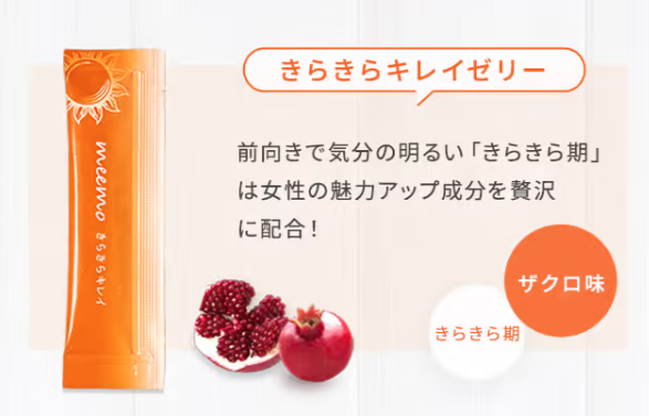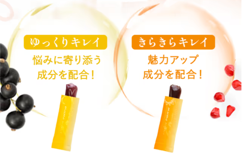 ナチュラル成分と女性リズムに寄り添う2種類のゼリータイプ。朝の“きらきらキレイ”と夜の“ゆっくりキレイ”で、内側から整えるボディケアが可能です。