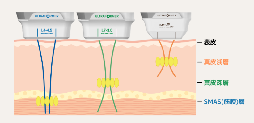 ウルトラフォーマーⅢは、高密度焦点式超音波(HIFU:High Intensity Focused Ultrasound)の技術を用いた美容機器です。真皮層・筋膜層(SMAS層)・皮下組織や脂肪層に超音波エネルギーを届け、点状に熱エネルギーを加えることで、肌のハリや引き締めをサポートします。