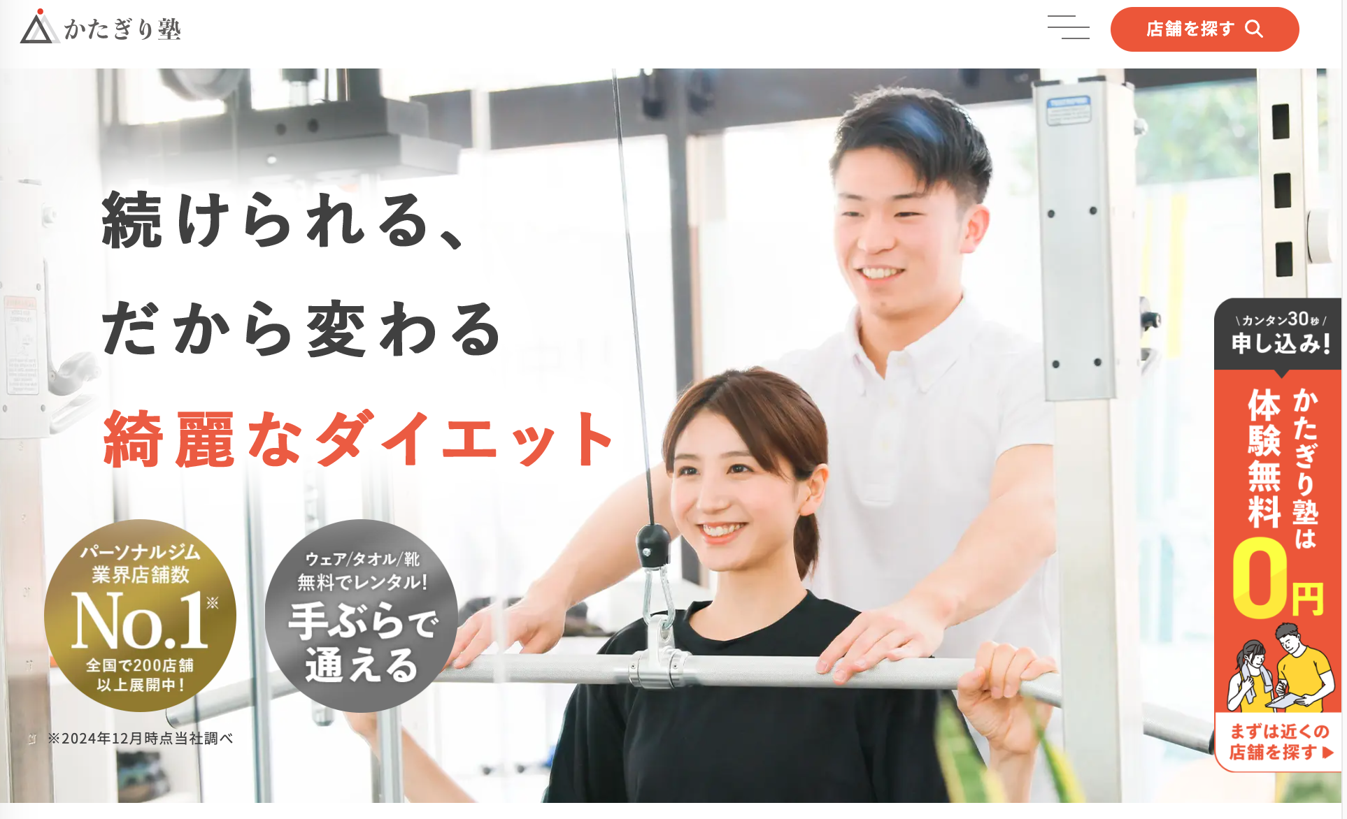 かたぎり塾 柔軟なプラン、初心者に優しい 全国展開、駅近が多い 長期的な食事指導が充実 親身で丁寧、初心者対応が好評 続けやすい、コスパが良い コスパが良い、料金抑えめ