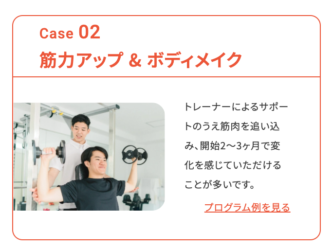 ボディメイクに精通したトレーナーがサポートに付き、安全にピンポイントで筋肉を追い込みます。自分ひとりではなかなか実感出来なかった方も通塾から2〜3ヶ月を境に自分の体型の変化を感じて頂けることが多いです。