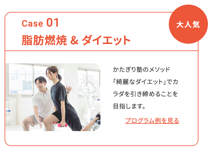 無理なく、自分に合ったやり方でカラダを引き締めたい方に一番人気のパーソナルトレーニングプログラムです。かたぎり塾ではこのオリジナルのダイエットメソッドを「綺麗なダイエット」と呼んでおり、効率よく痩せたい女性におすすめです。