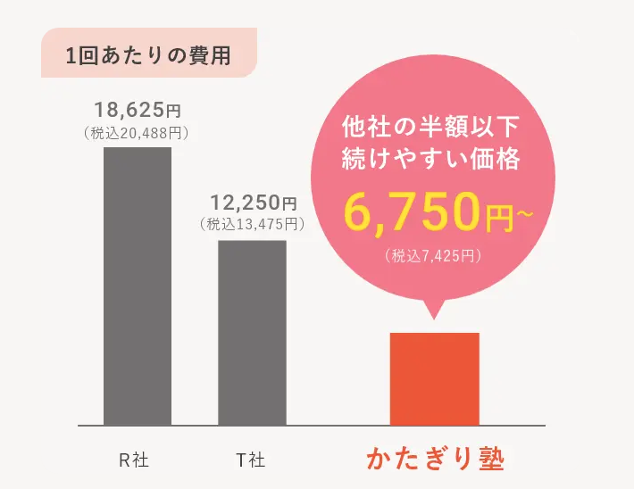 かたぎり塾では、トレーニング時の食事指導や運動の習慣化をお財布に優しい価格で提供します。短期で数十万円もするパーソナルジムとは比較にならないコスパで通塾が可能です。