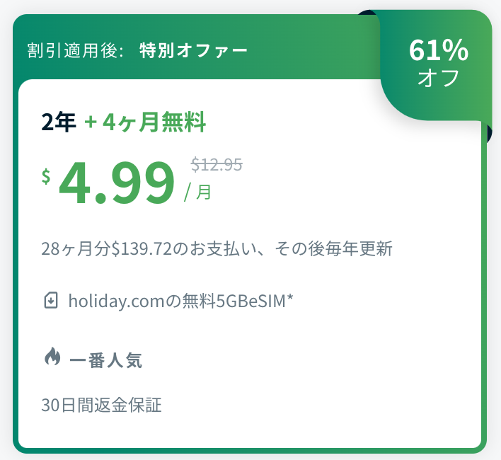 現在ご利用いただける中でも人気のプラン。30日間の返金保証付きで、安心してお試しいただけます。