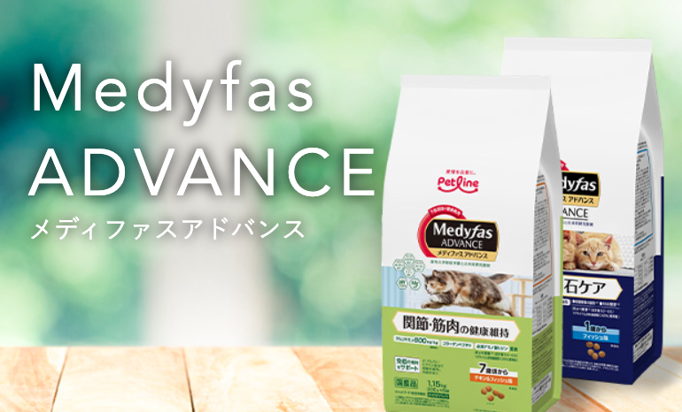 「メディファス アドバンス 関節・筋肉の健康維持 7歳頃から チキン&フィッシュ味」は、高齢猫の関節や筋肉の健康をサポートしたい飼い主におすすめ。主に7歳からの高齢猫向きの商品で、関節・筋肉の健康維持に加え下部尿路の健康維持に向いています。
