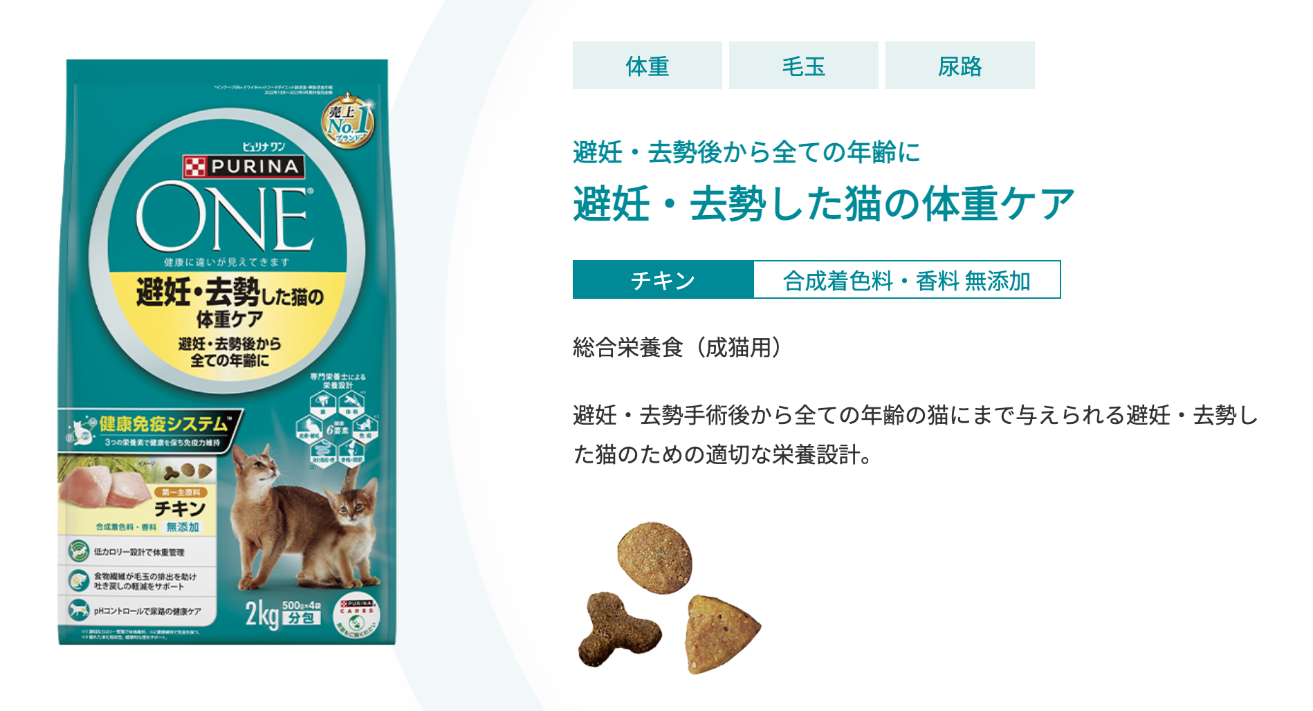 「PURINA ONE 避妊・去勢した猫の体重ケア」は、肥満になりやすい避妊・去勢した猫のために低カロリー設計で作られたフード。避妊・去勢手術後から、すべての年齢の猫に与えられます。