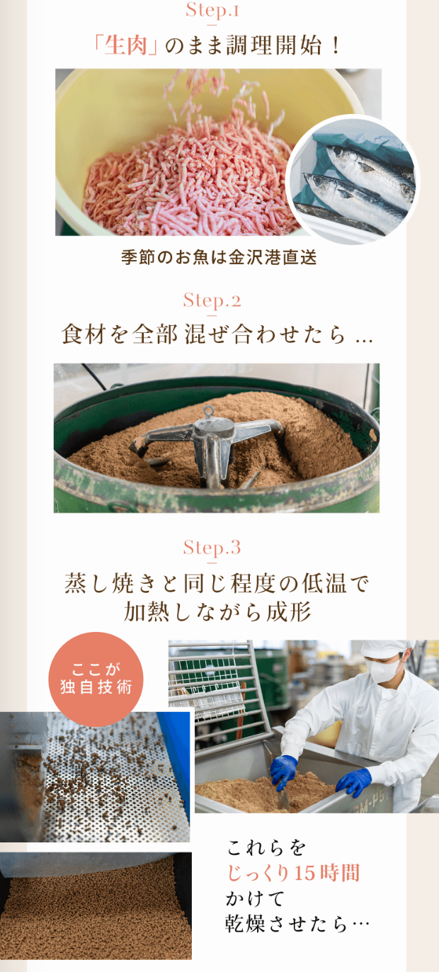 時間をかけてじっくり丁寧に仕上げることで、食欲をそそる自然なお出汁のような香り、納得のおいしさ、食べっぷりを実現しました。