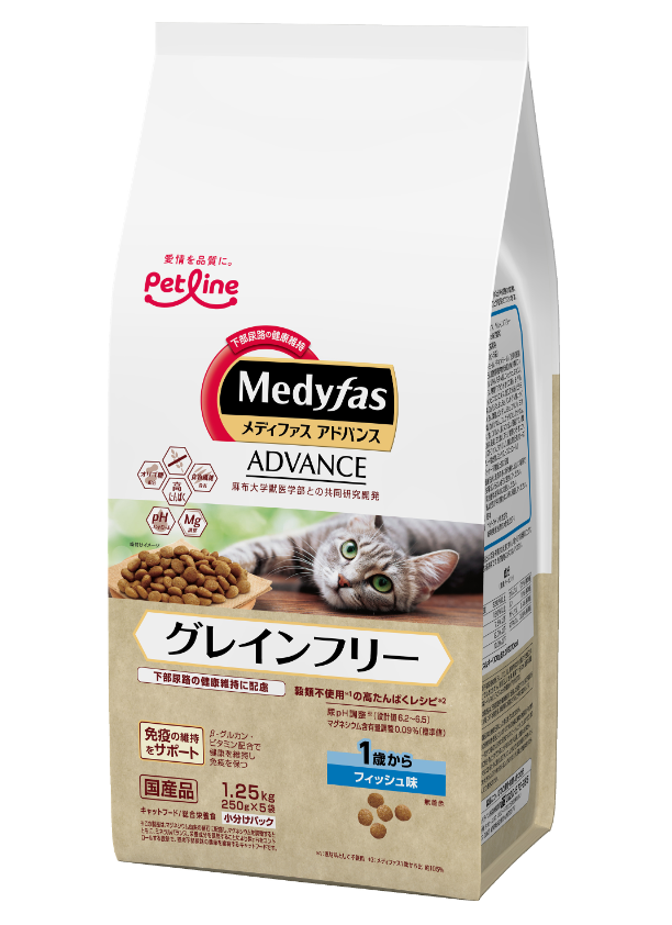 「メディファス アドバンス グレインフリー 1歳から チキン&フィッシュ味」は、穀類不使用・ミートファーストかつ下部尿路の健康維持に配慮された、麻布大学獣医学部との共同研究をもとに開発された商品。とくに下部尿路のヘルスケアを気にしたいという飼い主さんに向いています。