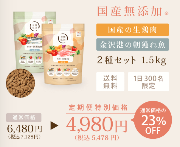 現在、初回お試しコースには生真鯛と国産鶏肉を使ったペーストタイプのおやつ「濃厚ピューレ」がついてきます。フードに混ぜてあげると、上手に切り替えができますし、食いつきのアップにもなります。