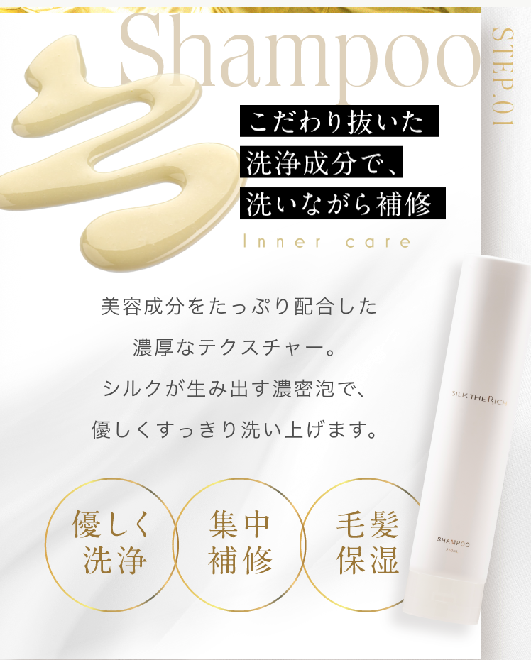| SILK THE RICH シルクシャンプー | 6,980円 | 最高級シルク100%、アルガンオイル、ヒアルロン酸、ヘマチン、ヒト幹細胞培養液 | シルクプロテインがコーティングし、しっとり&滑らか | アミノ酸系洗浄成分で優しく洗いながら補修・保湿 | ゴールデンペアー&フリージアの香り、香水のように長持ち |