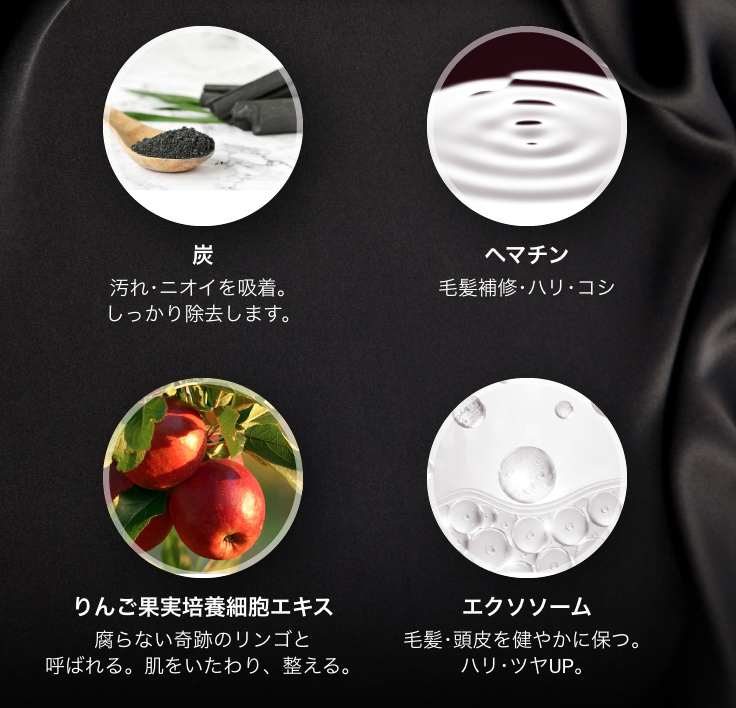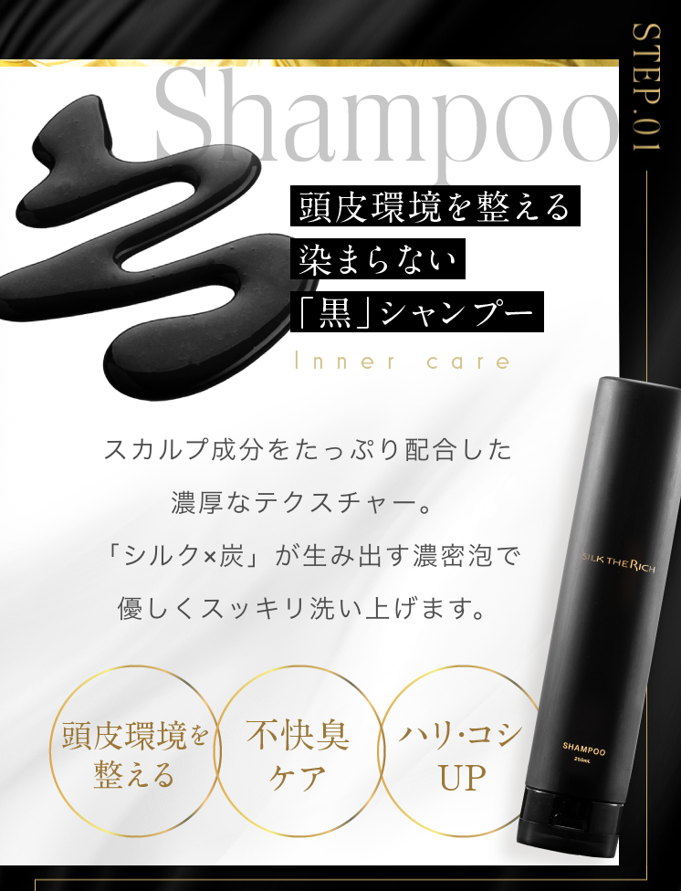 「頭皮が生まれ変わる、極上の癒し体験。」 まるで美容液のような濃厚なトリートメントが、ダメージを受けた頭皮を優しく包み込み、健やかな状態へと導きます。シルクと炭の力で、頭皮の悩みを徹底的にケア。毎日の洗髪が、至福のリラックスタイムに。- 内容量:250ml+250ml