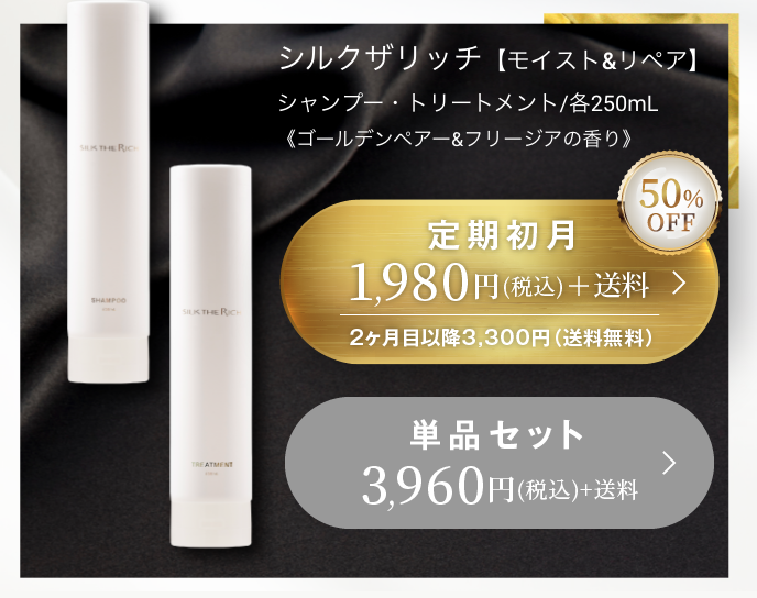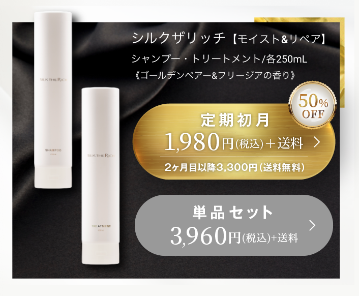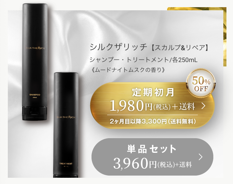 | 1位 | SILK THE RICH(スカルプ&リペア) | 単品セット: 3,960円 / 定期初月: 1,980円 | 250ml+250ml | シルクプロテイン、炭、18種類のアミノ酸 | しっとり、ツヤと潤いを与えまとまりやすい髪に | アミノ酸系 | ムードナイトムスク | ◯ |