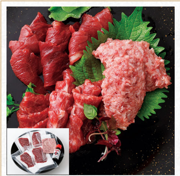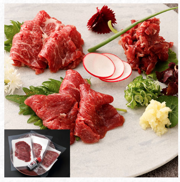 霜降りと赤身の2種類を楽しめるセットです。異なる部位の食感や味の違いをお試しいただけます。今なら、桜うまトロ(馬肉ネギトロ)60gを特典として1パック追加でお届けします。
