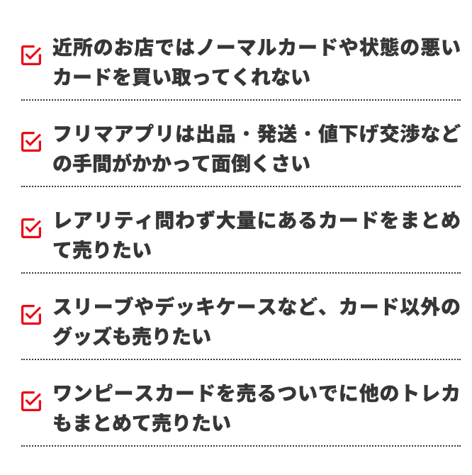 レアカード・ノーマルカード・状態の悪いカード・禁止カード、サプライ品など、ワンピースカード関連なら何でも買取査定します。