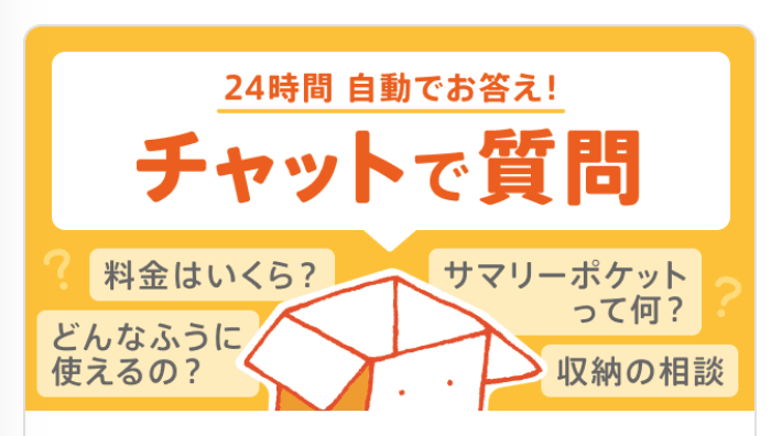 | サマリーポケット | 全国(一部離島を除く) | ダンボール、小型家具、衣類など | 1ヶ月 | 取り出し1回ごとに800円 | 月額330円(税込)~ |