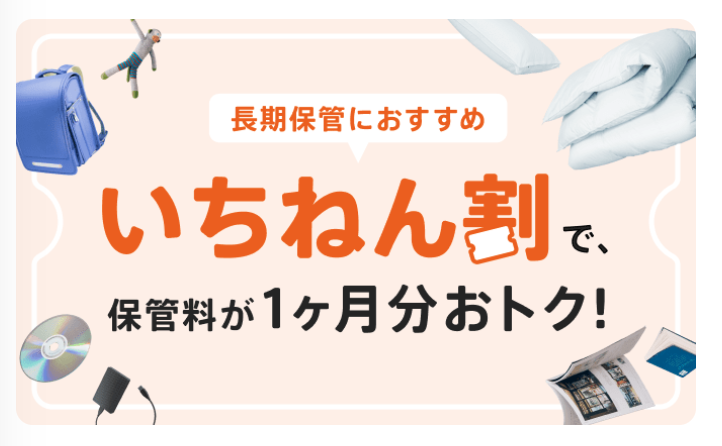 「いちねん割」は月額保管料が1ヶ月分おトクになる、12ヶ月間分のボックス保管パスです。 いちねん割の適用期間の途中に適用されたボックスを取り出しても、パスの残りの期間を同じプランの別のボックスに適用することができます。
