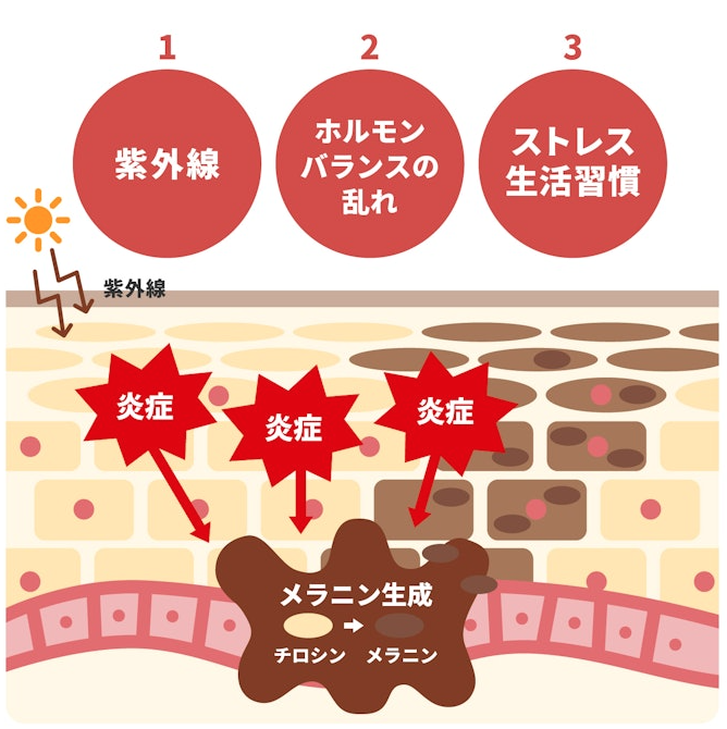 2つ目はホルモンバランスの乱れによるもの。一時的にメラニンが多く作られることで、ターンオーバーの乱れにもつながります。