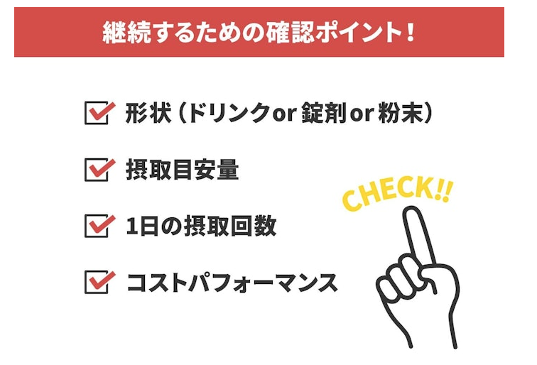 毎日続けられるかどうかも大切なポイントです。特にサプリメントは、飲みやすい形状や用量を確認しましょう。