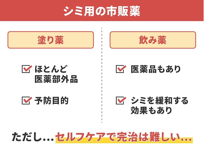 自分の症状にあったものを上手に選び、継続することがシミを緩和させる近道なので、しっかり選ぶポイントをチェックしましょう。塗り薬との併用もより効果的です。
