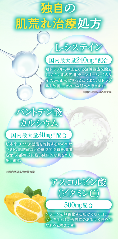 特徴と魅力 L-システインとビタミンCを主成分とし、肌の健康をサポート。シミやそばかすだけでなく、疲れた肌の回復にも役立ちます。