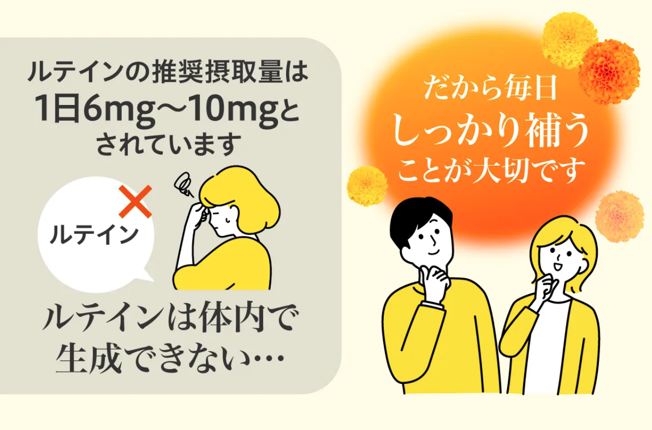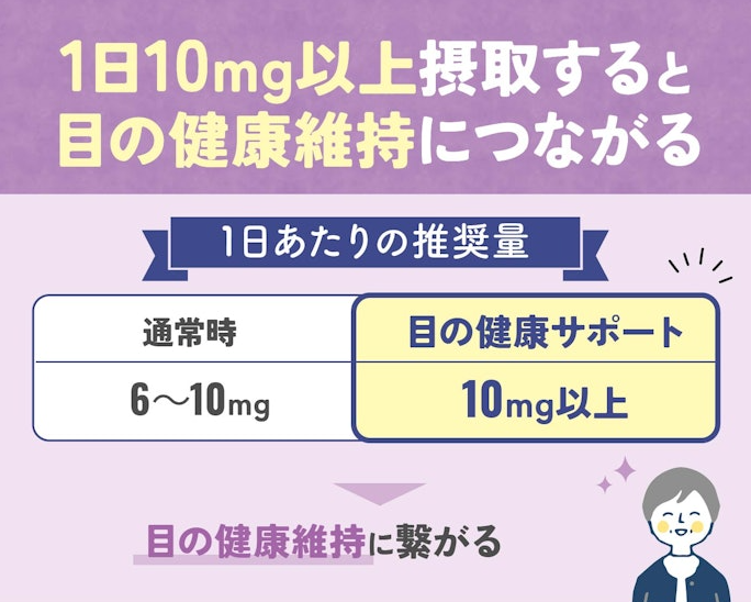 ルテインの1日の摂取目安は6〜10mgが望ましいとされていますが、より効果的に目の健康をサポートするには10mg以上の摂取が推奨されています。そのため、サプリメントを購入する際は、10mg以上含有している製品を選ぶとよいでしょう。
