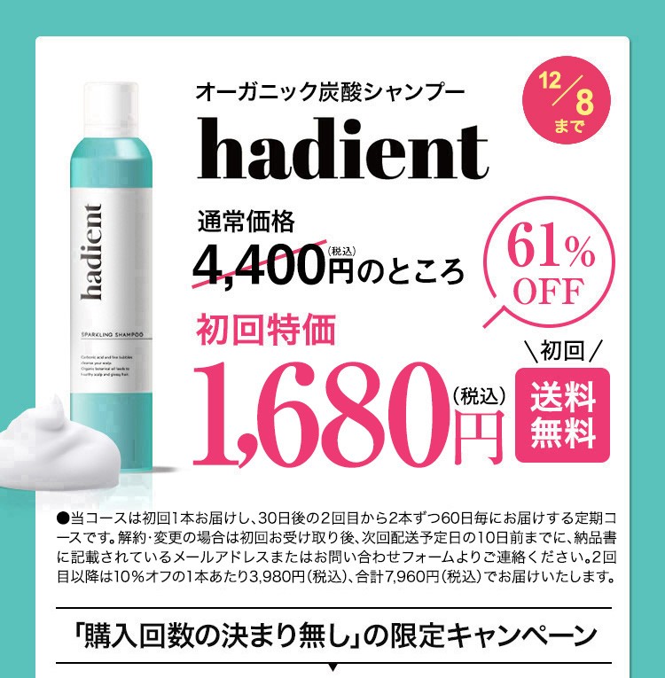 中でもHadient(ハディエント)炭酸シャンプーは、頭皮のベタつきやニオイをすっきり洗い上げながら、髪にやさしい成分設計にこだわった一品として、多くの方に選ばれています。
