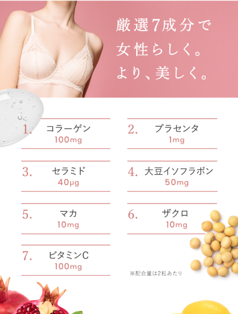 1日2粒で、エラスチン・コラーゲン・大豆イソフラボン・ザクロ・ビタミンCなど、内側から美しさをサポートする成分をバランスよく配合。