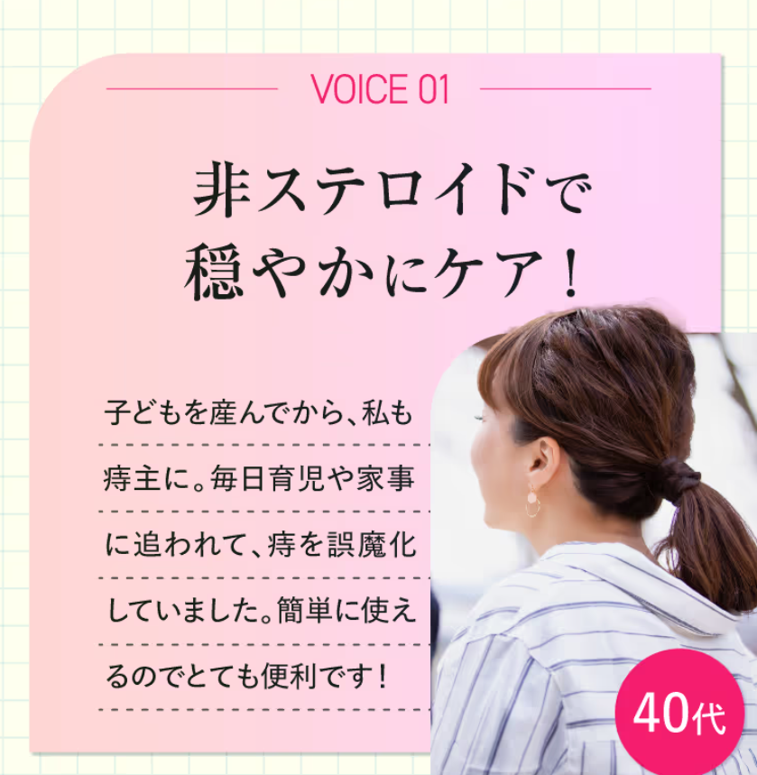 非ステロイドでありながら、痛み・かゆみ・出血・腫れ・ただれを緩和する5種類の有効成分を配合。