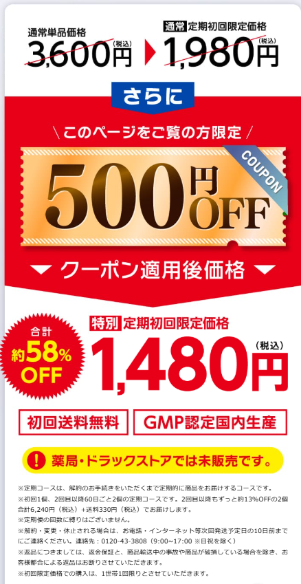通常価格は30日分で3,600円(税込)ですが、公式サイトの定期コースでは初回限定で約57%OFFの1,480円(税込)という非常にお得なキャンペーンを実施していることがあります。