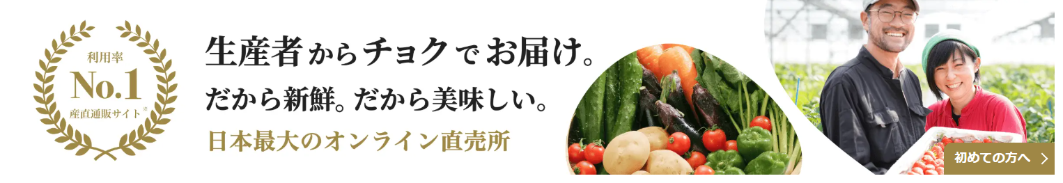 国内最大級の産直通販サイトとして、市場を介さない「チョク」での配送にこだわっています。収穫から最短24時間以内に自宅に届くという圧倒的なスピード感は、これまでの通販の常識を覆すものです。