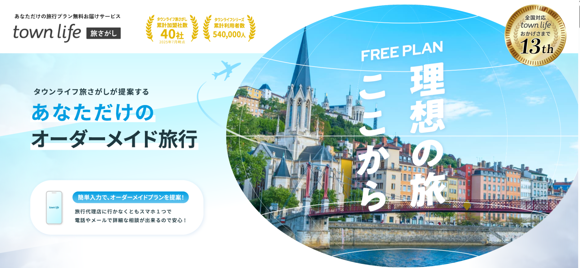 タウンライフ旅さがしは、複数の旅行会社からあなただけのオリジナル旅行プランを無料で一括請求できるサービスです。