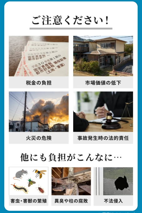 固定資産税・管理費・老朽化・防犯・近隣への影響。