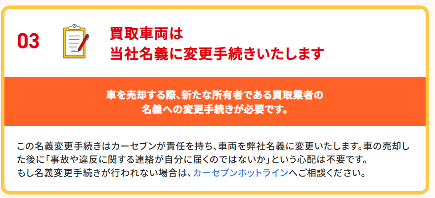A. はい、可能です。名義変更などの面倒な手続きもカーセブンがすべて代行いたします。